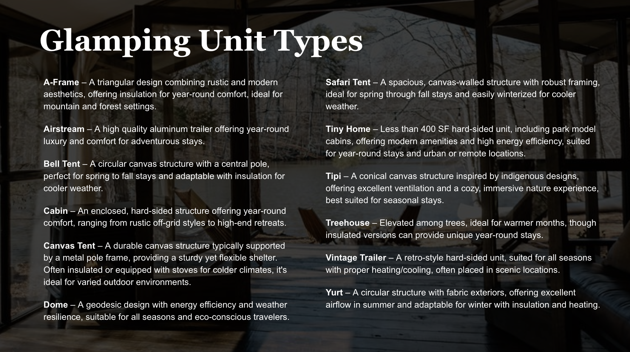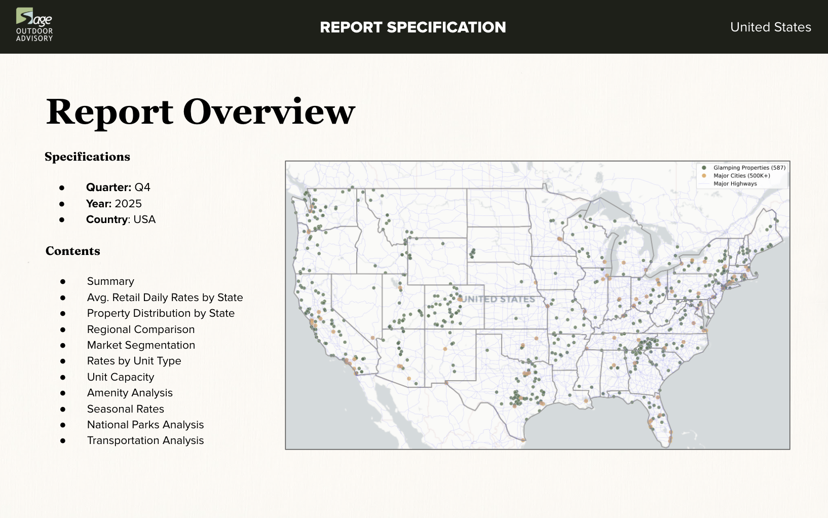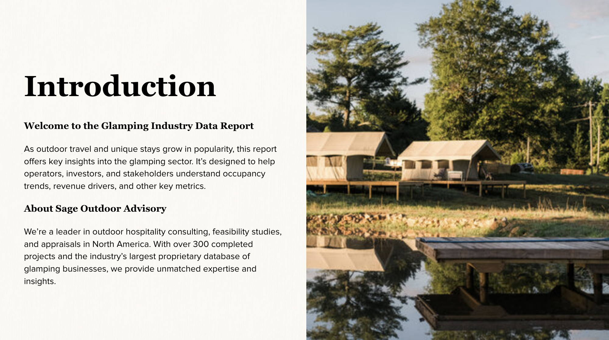 Created by Sage Outdoor Advisory, this report is backed by North America’s largest proprietary database of glamping businesses and findings from over 300 completed feasibility studies. Our data is hand-validated and methodically analyzed to reflect current trends and actionable insights.